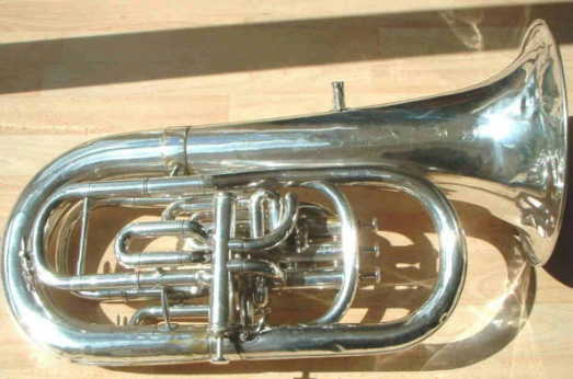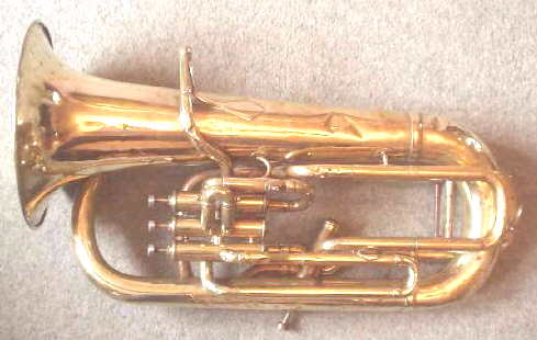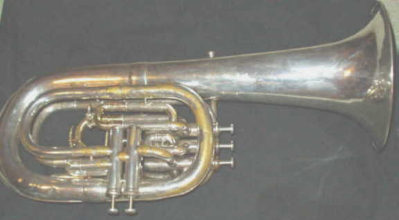 An F.E. Olds marching Baritone, with one piston, one rotary valve and pitched in G.